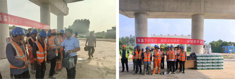 為給高溫下堅(jiān)守崗位的一線工人送去清涼與慰問(wèn),確保他們?cè)诟邷丨h(huán)境下的身體健康和工作安全,同時(shí)表達(dá)對(duì)一線工人辛勤付出的感謝,7月11日,鹽城經(jīng)開(kāi)城投集團(tuán)副總經(jīng)理張志軍一行組成慰問(wèn)組,先后前往鹽洛高速步鳳互通、步鳳小學(xué)擴(kuò)建(一期)、鳳舞華庭等項(xiàng)目現(xiàn)場(chǎng)開(kāi)展“夏季送清涼”活動(dòng)。